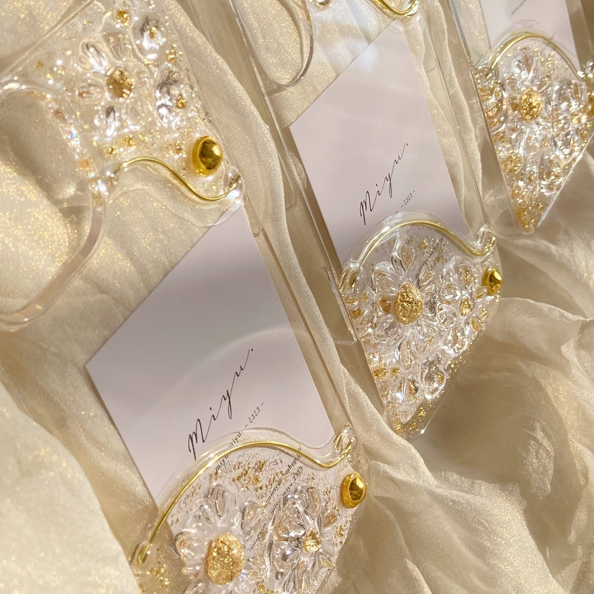 花芯には金箔を封入して、その上からぷっくりつるつるにコーティングしています。