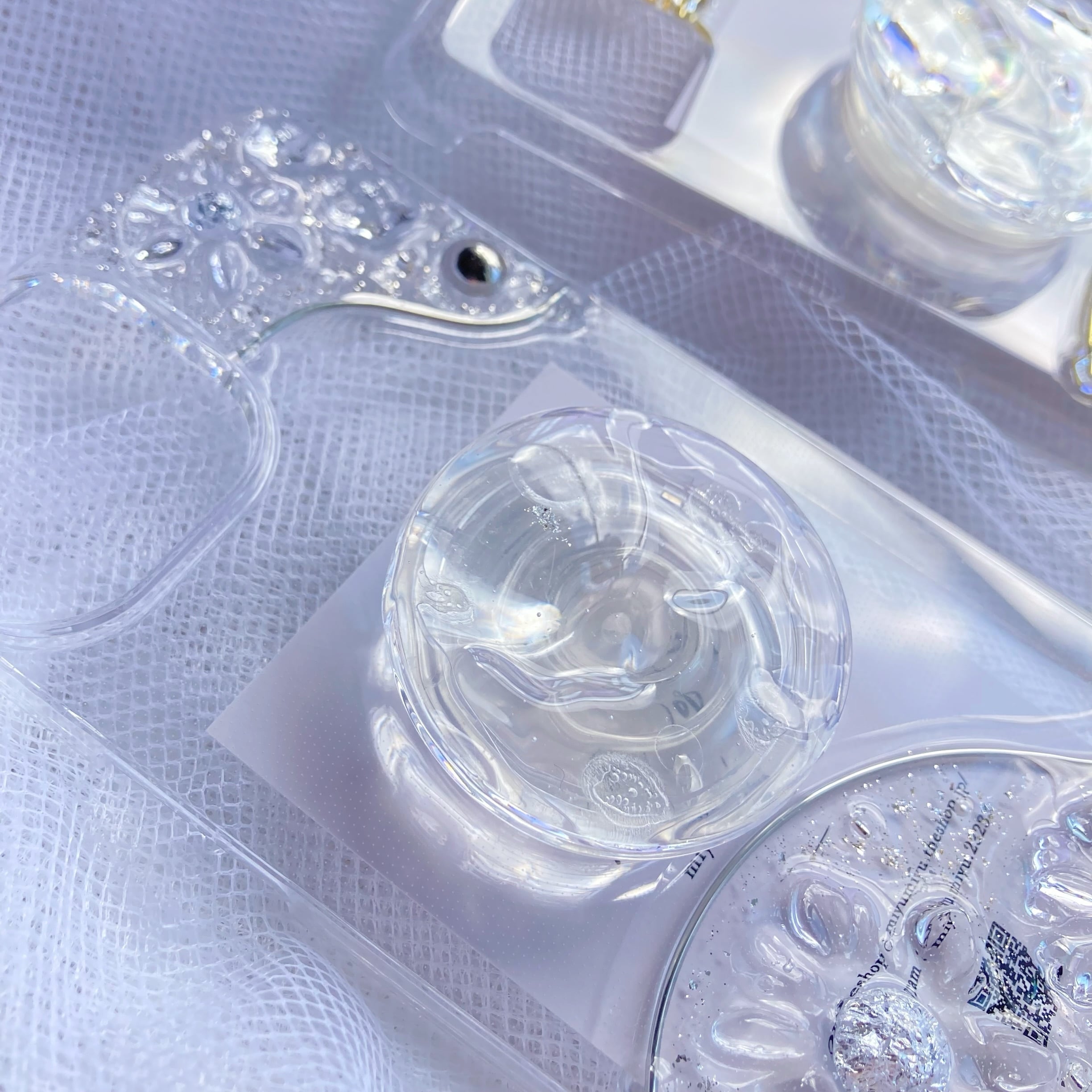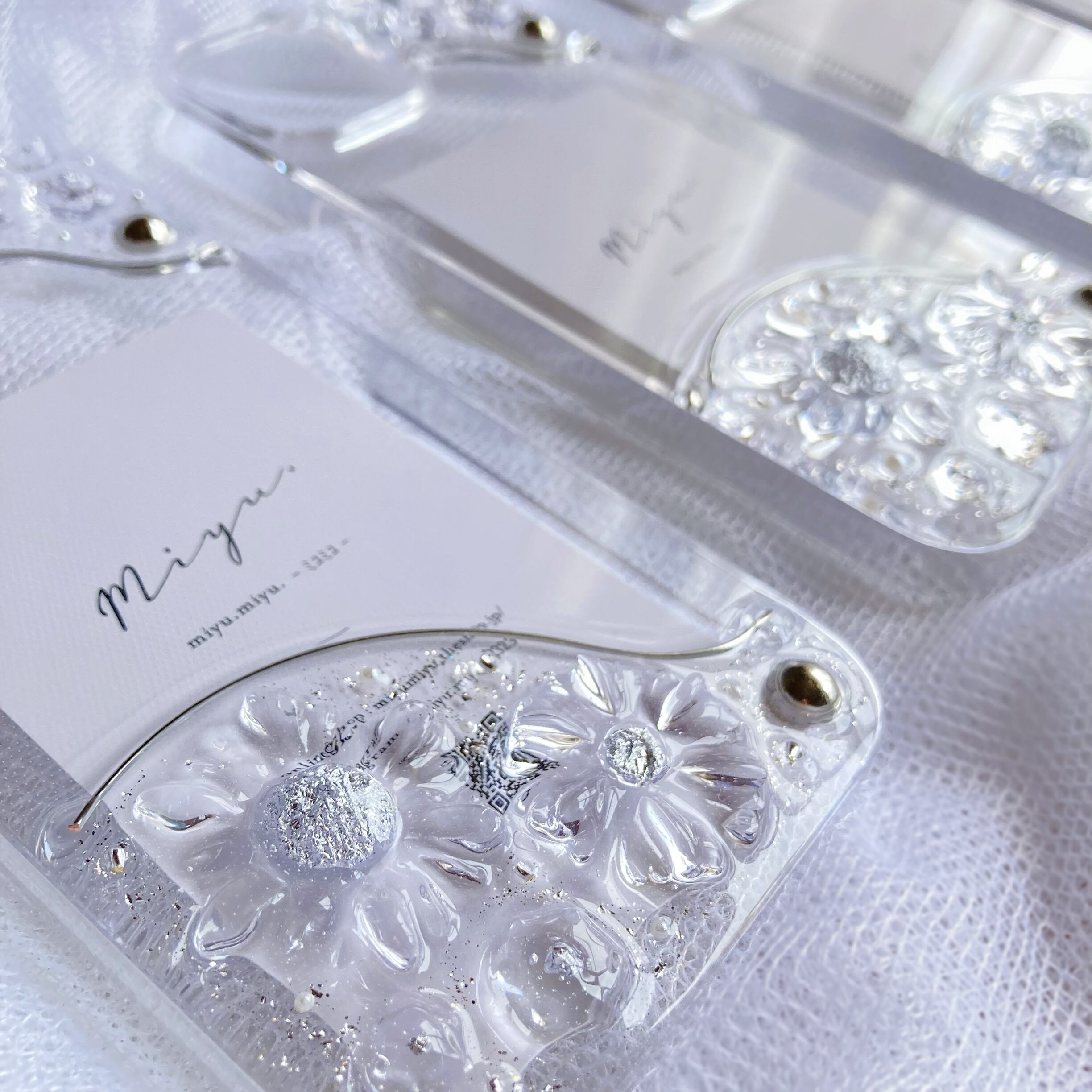 透明感たっぷりなクリアflowerと、散りばめられたラメやビーズなど様々な輝きを詰め込んだキラキラ可愛いデザイン。