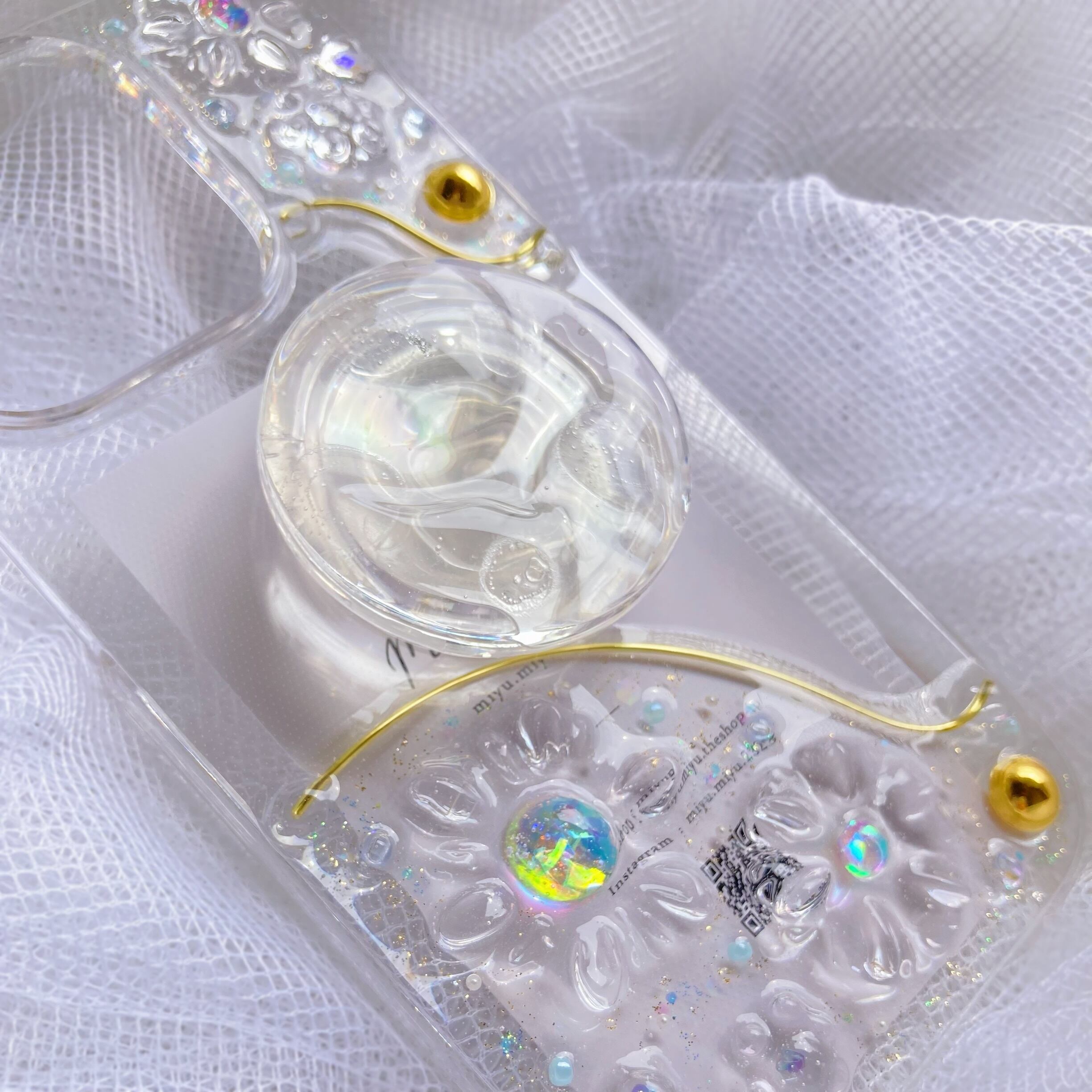 透明感たっぷりなクリアflowerと、散りばめられたラメやビーズなど様々な輝きを詰め込んだキラキラ可愛い【 shiny flower】デザイン。